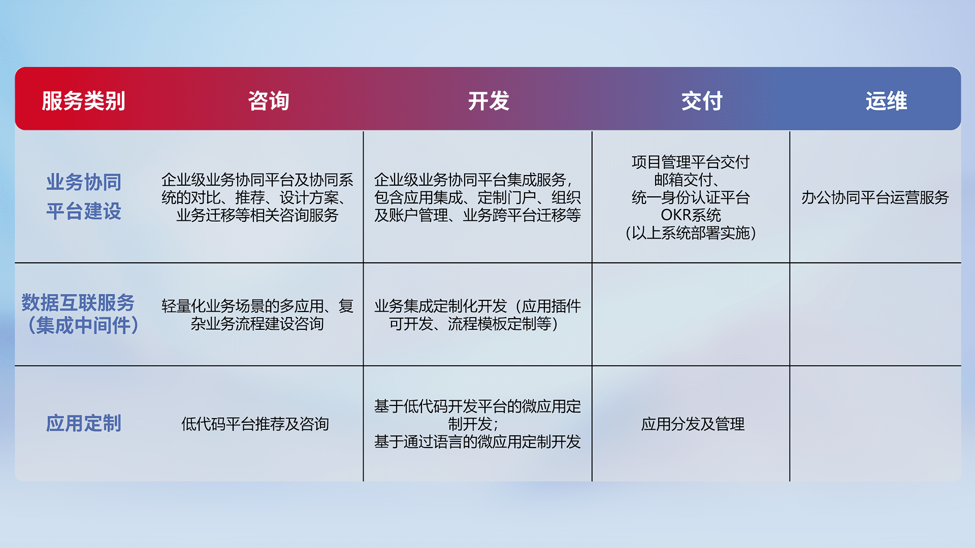针对钉钉、、、企微、、、IDaas等平台级产品提供产品的规划、、、、方案、、、交付、、、、定制化开发等服务,,,,实现如统一协同办公、、智能客户服务、、、混合会议管理、、、智能数据查询、、、等业务场景,,,实现数字化转型。。。