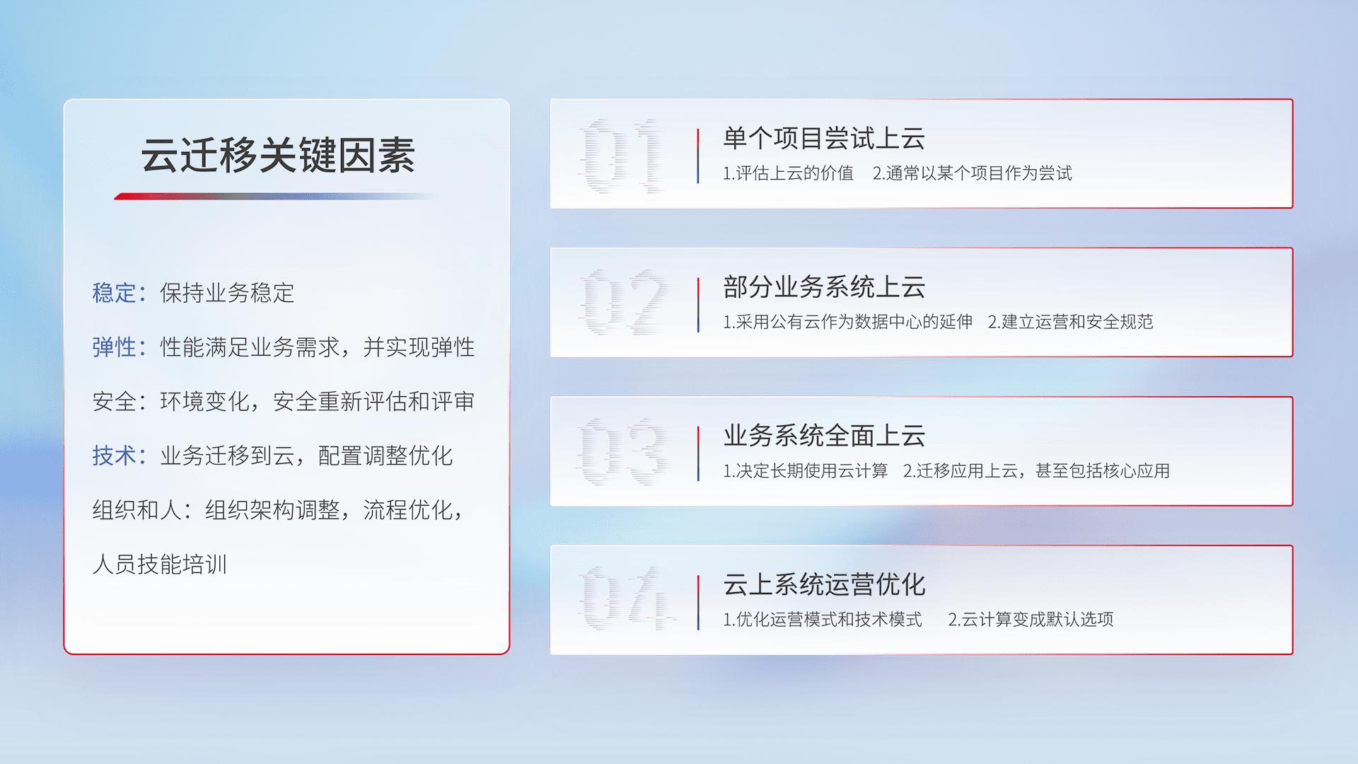 结合实际业务,,,从规划设计、、、、云平台选型、、、云原生改造、、、、数据迁移、、、、集成交付,,,,迁移全过程为客户识别最佳上云路径,,,做好风险识别管理,,设计网络架构、、、身份权限、、安全审计合规、、操作审计、、、、日志审计、、监控告警策略、、、多站点容灾设计等,,,对云上基础设施进行整体规划,,提升IT治理水平,,以满足弹性、、、高可用、、高性能的需求。。。