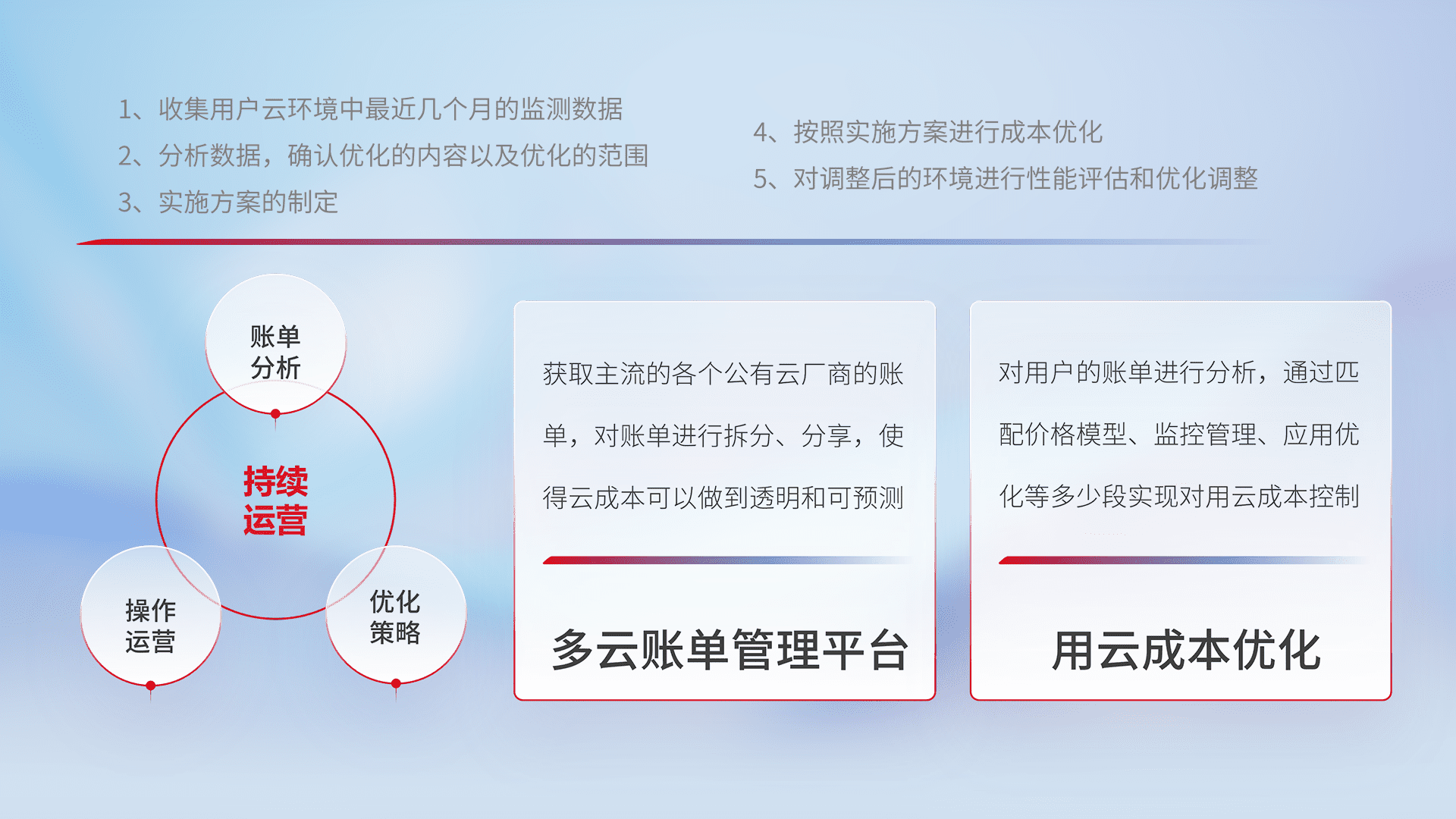 通过多云纳管,,以统一的资源数据模型把客户的云资源进行抽象和封装,,进而实现对多云资源的统一操作,,,,保障云资源管理的可靠性、、、稳定性与可用性。。量身定制化运维内容,,,配置、、、开发运维、、补丁管理、、、、备份、、、监控、、、认证和访问管理、、、、审计和日常巡检等,,,保障在用云过程中的可靠度,,稳定度以及高可用率。。。。