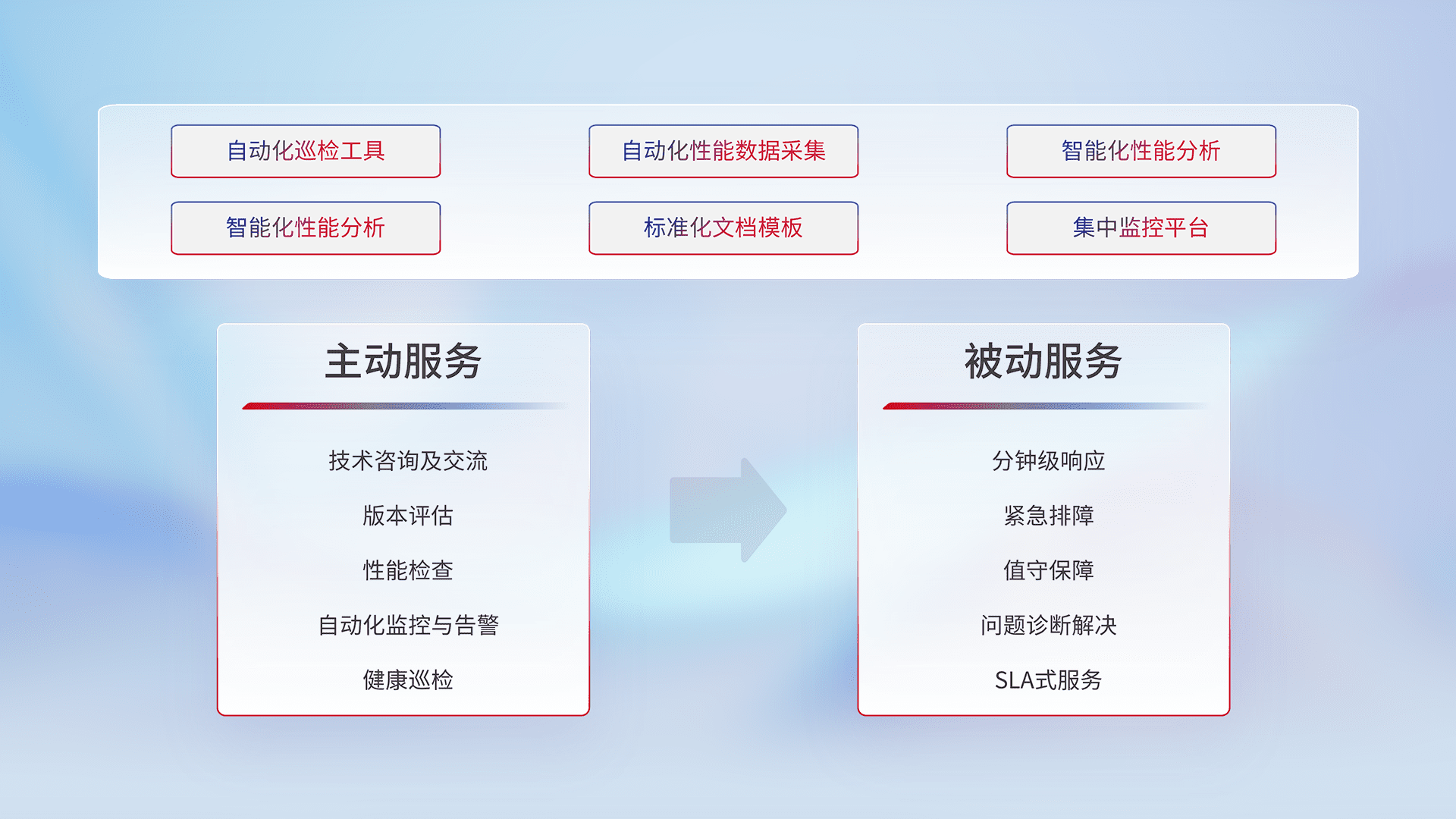 智能化工具和标准化文档,,,,保障服务质量,,提供主动服务(包含技术咨询、、、版本评估、、性能检查、、自动化监控与告警、、、、健康巡检)和被动服务包含(分钟级响应、、、紧急排障、、、值守保障、、、、问题诊断解决、、、SLA服务)。。。